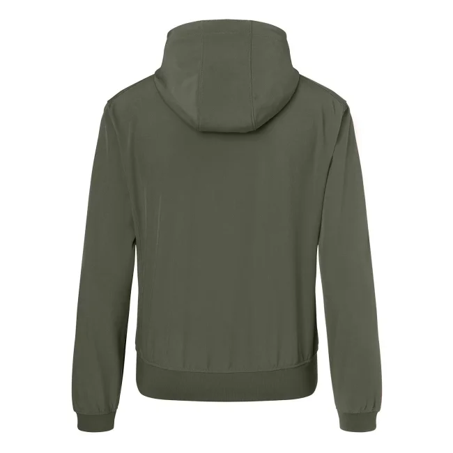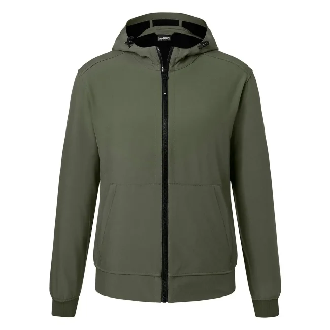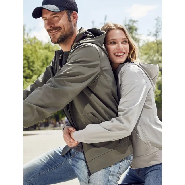 94% poliestere, 6% elastan. Giacca in softshell a 2 strati con cappuccio, parte interna in contrasto, elastico in vita e nei polsini. Tasca a marsupio con cerniera, 1 tasca interna, cappuccio regolabile.