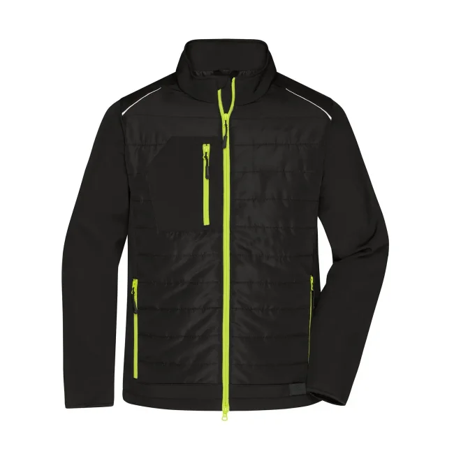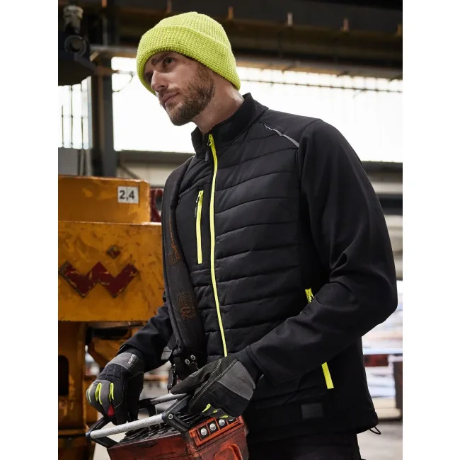 100% poliestere riciclato. Rivestimento: 100% pol. ric. Imbottitura: 100% pol. Giacca softshell a due strati,trapuntato davanti e dietro, idrorepellente e antimacchia grazie al BIONIC FINISH ECO, imbottitura Warming DuPont Sorona, colletto alto, tasche laterali e sul petto, 1 tasca interna, dettagli riflettenti (no DPI), zip: YKK.