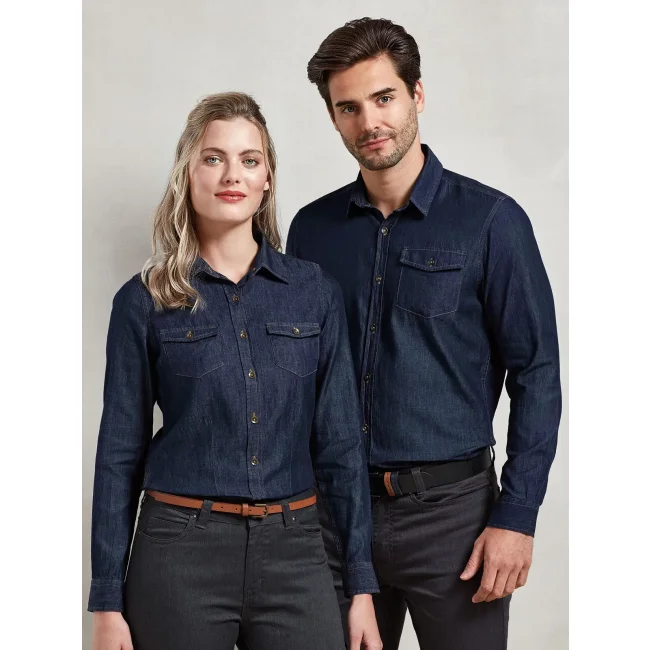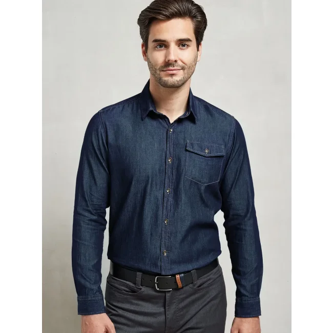 100% cotone denim ring spun. Camicia uomo manica lunga con taschini sul petto, chiusura con bottoni sui polsini e orlo arrotondato sul fondo.