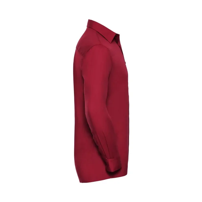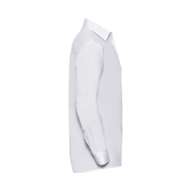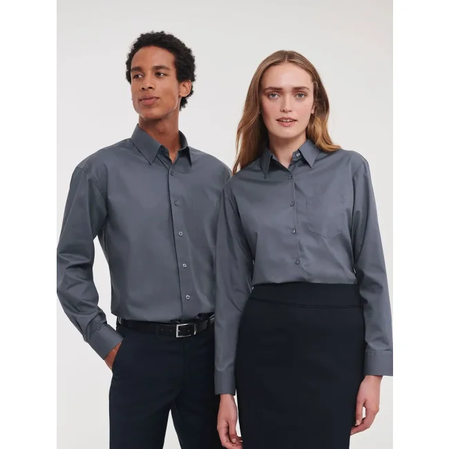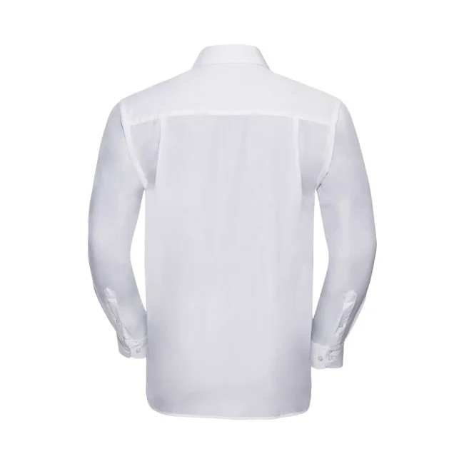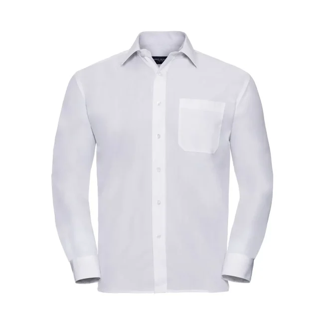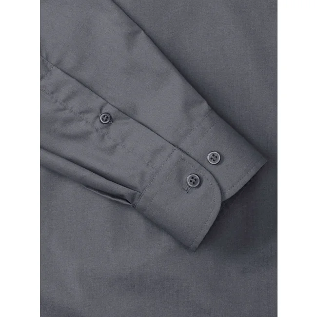 65% poliestere 35% cotone. Camicia in popeline con colletto classico con stecche, taschino lato cuore, orlo dritto. Polsini stondati con 2 bottoni regolabili. (Col 30: 110g/m²).