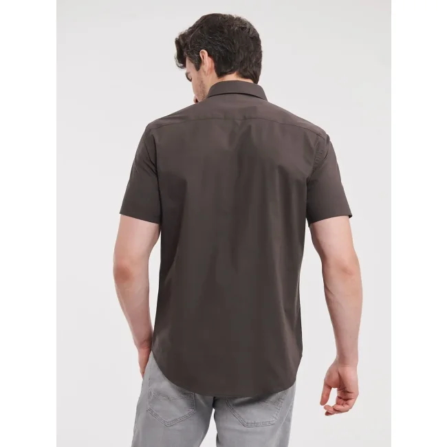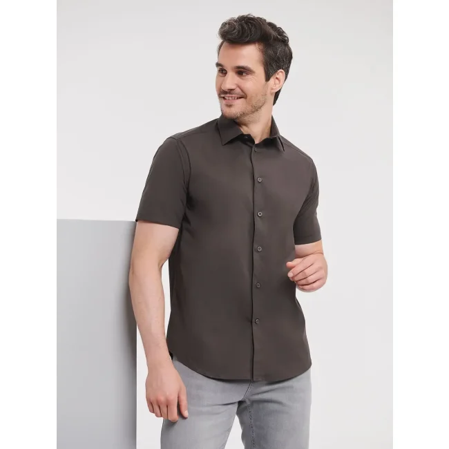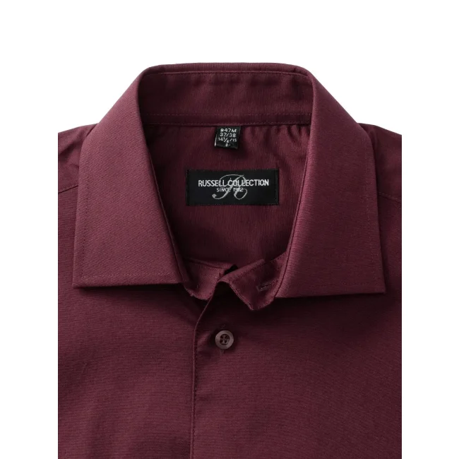 97% cotone 3% elastan. Camicia elegante, colletto semiaperto con bottone singolo perlato, orlo stondato. Bottone di riserva.