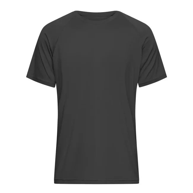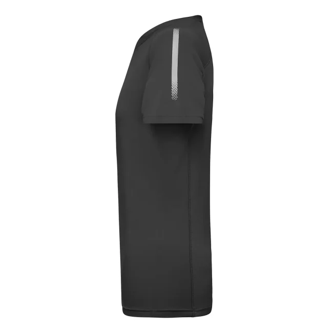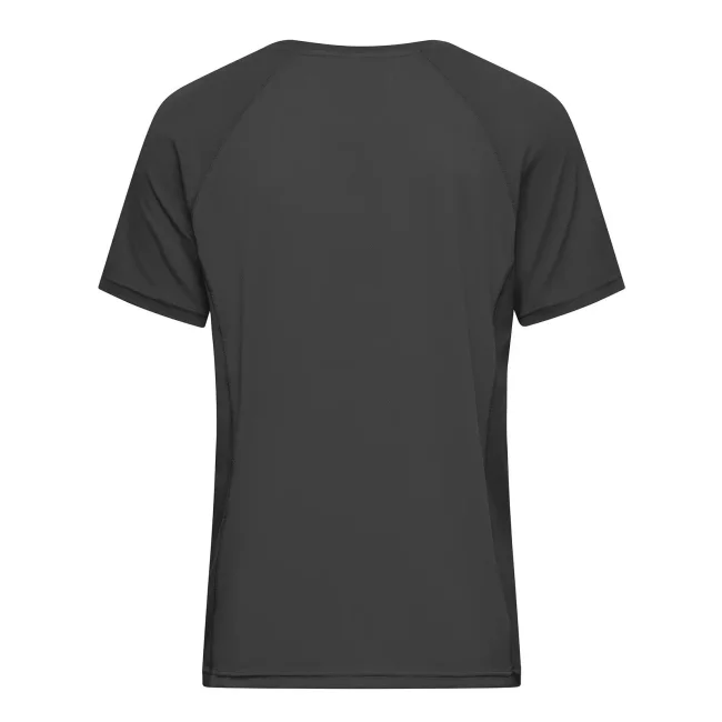 92% poliestere riciclato 8% elastan (tessuto esterno 1), 100% poliestere riciclato (tessuto esterno 2). T-shirt sportiva alla moda, traspirante e con regolazione umidità, asciugatura rapida, leggera e confortevole, maniche raglan, collo rotondo, retro leggermente lavorato, stampa a contrasto sulle spalle.