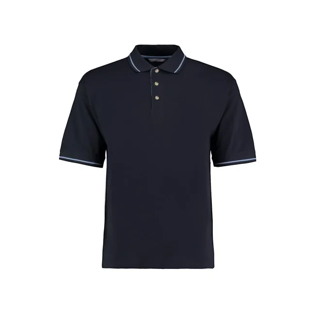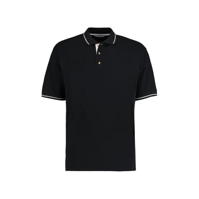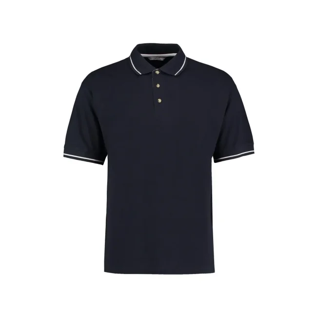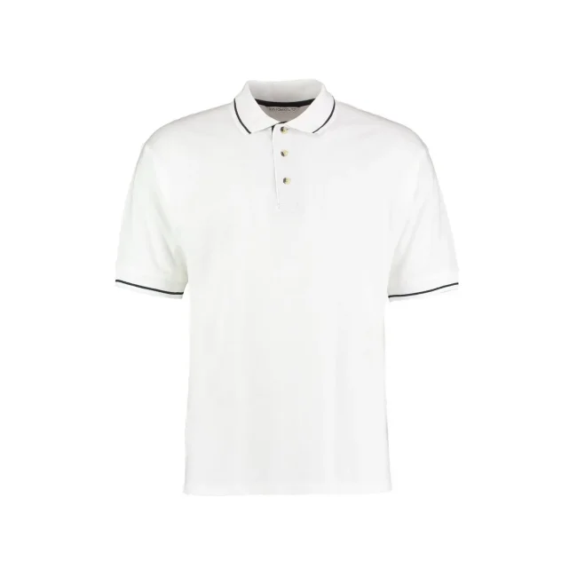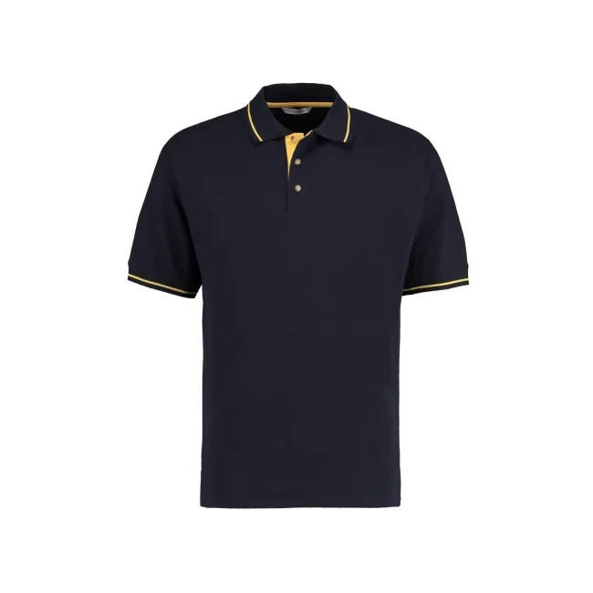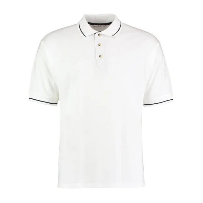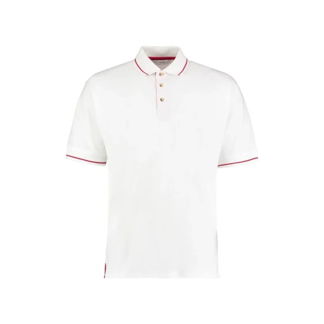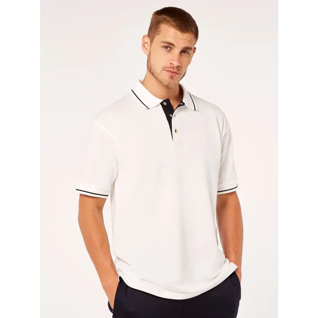 100% cotone piqué pettinato. Polo a maniche corte set-in, parte interna del colletto di colore contrastante, 3 bottoni stile corno, righe in contrasto su colletto e giromanica, struttura con cuciture e spacchetti laterali.