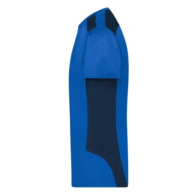 50% cotone organico, 50% poliestere riciclato. T-shirt easy-care , tessuto robusto, resistenza al lavaggio ottimale, inserti contrastanti su spalle e sui lati, colletto con elastan, nastro di rinforzo sul collo.