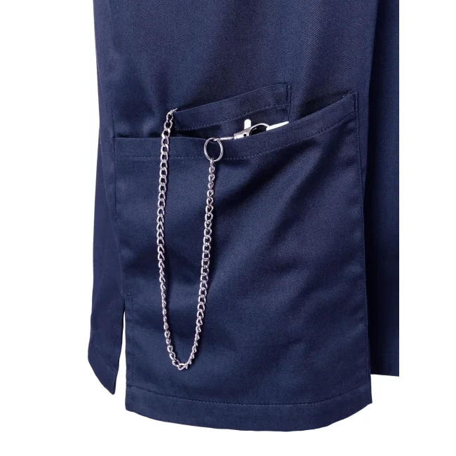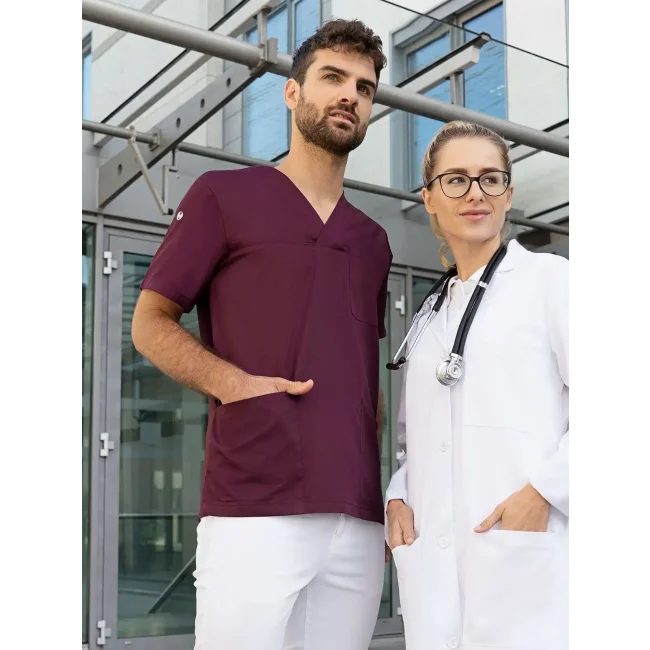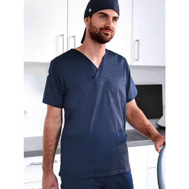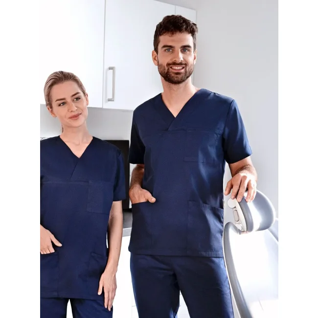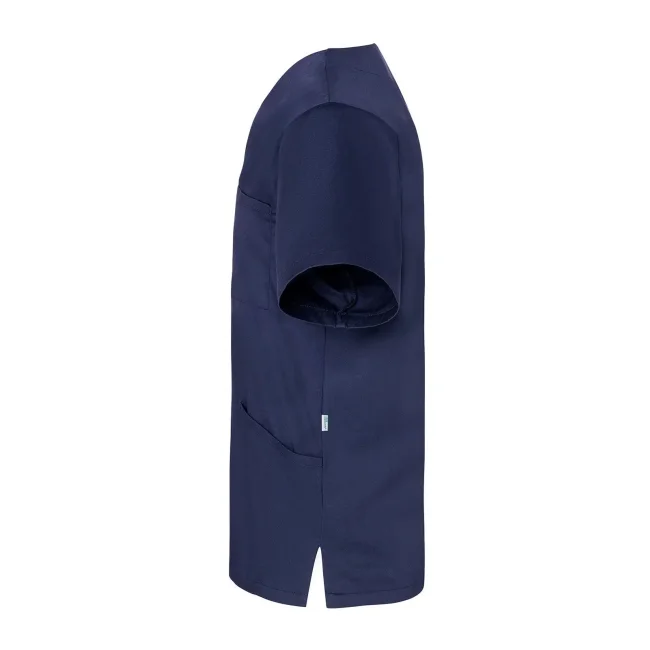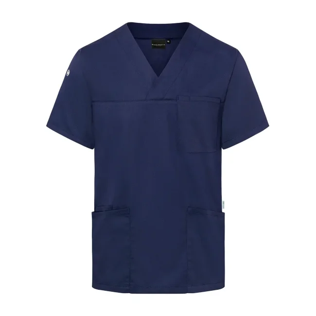 65% poliestere riciclato, 35% cotone. Camice da uomo facile da indossare e sostenibile, collo a V e maniche corte, taglio regular, altissima lavabilità per garantire purezza clinica. 2 tasche laterali con tasca interna nascosta a destra, 1 passante portachiavi nella tasca laterale, tasca sul petto a sinistra con tasca portapenne.