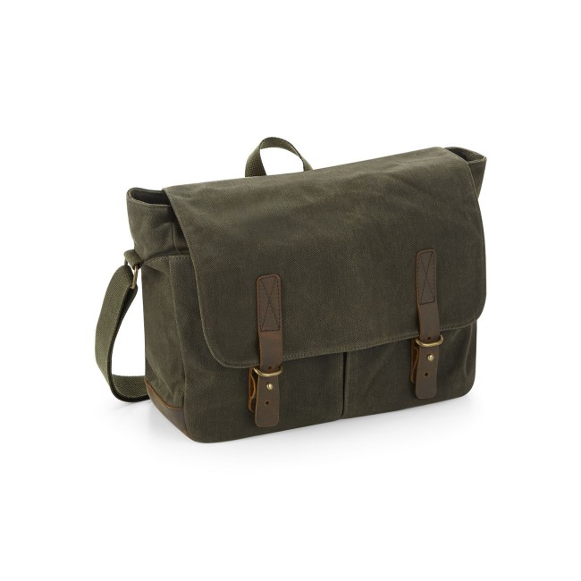 100% cotone canvas cerato resistente all'acqua. Borsa a tracolla con dettagli in vera pelle, scomparto principale con zip, due tasche frontali, chiusura con bottoni automatici, rifiniture effetto ottone anticato, completamente foderato, può contenere laptop fino a 14", manico in cotone. Dimensioni: 28x34x12 cm, capacità: 7 litri, area stampabile: 13x14 cm.