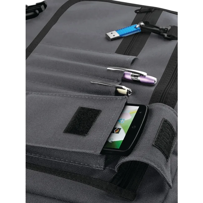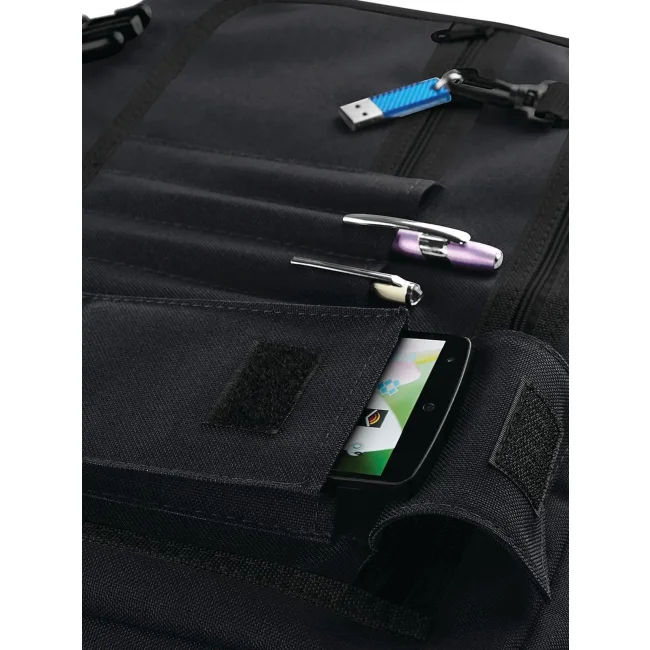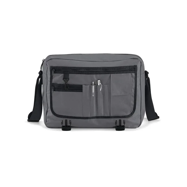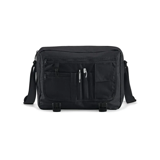 Messenger Bag realizzata in poliestere 600d, progettata con sezione organizer interna e tracolla regolabile. Le dimensioni sono 38 x 30 x 12 cm, con una capacità di 11 litri e un'area stampabile di 32 x 20 cm, adatta per branding aziendale.