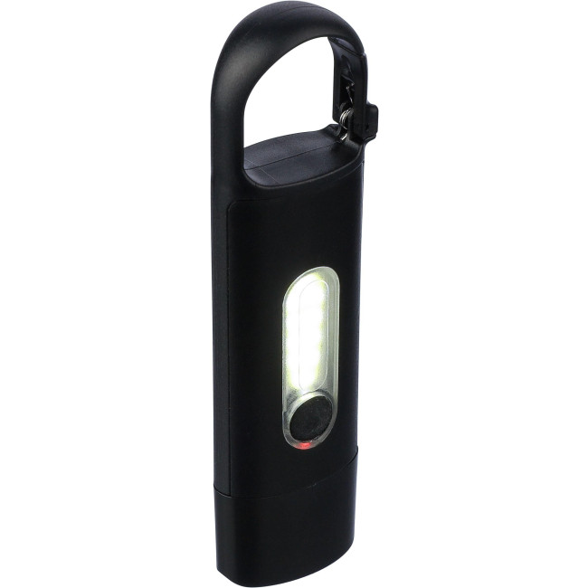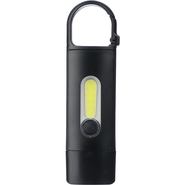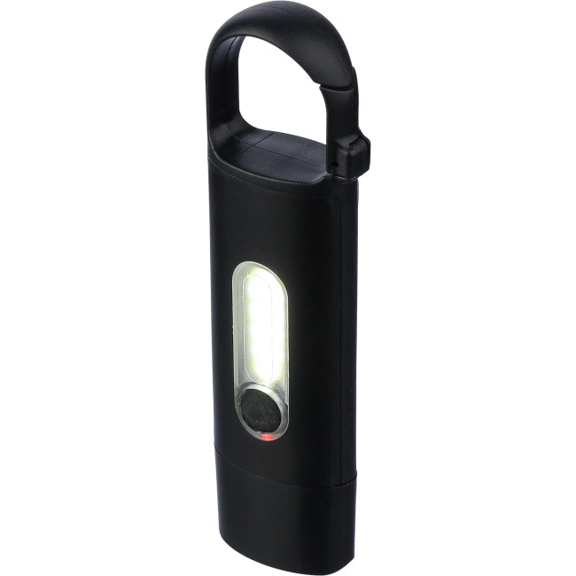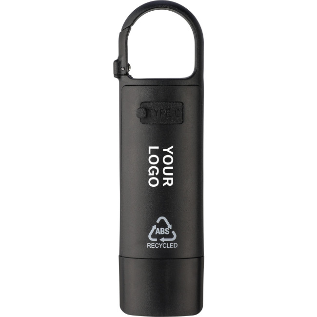 Mini torcia in ABS riciclato con batteria ricaricabile, USB integrata da 200 mAh e moschettone. Dotata di luce frontale COB e luce laterale COB, con tre modalità di illuminazione. Include cavo di ricarica USB-C e logo “ABS riciclato”, confezionata singolarmente in una scatola di cartone avana.