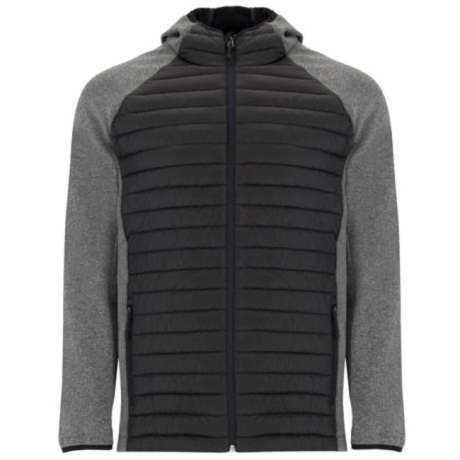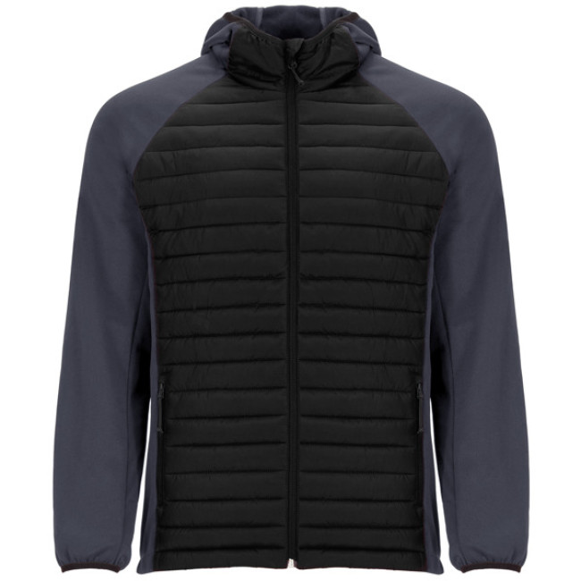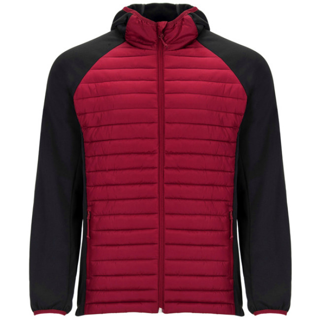 Giacca da uomo composta da due tessuti:Cappuccio fisso.Manica stile ranglan.Tessuto softshell nelle maniche, pannelli laterali e cappuccio.Tessuto imbottito tatto piuma nella parte frontale e nella schiena.Cerniera invertita in tinta con protettore per il mento e tiretto.Due tasche frontali con cerniera.Bordatura elastica in tinta su cappuccio e polsini.