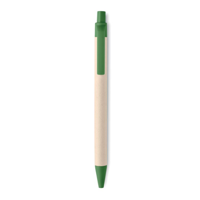 Penna a sfera a pulsante con fusto in cartone riciclato del latte (70%) e parti in PLA (in mais biodegradabile al 100%). Inchiostro blu.