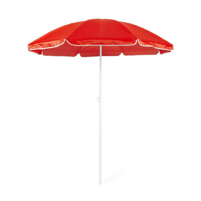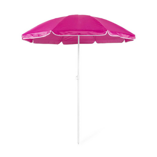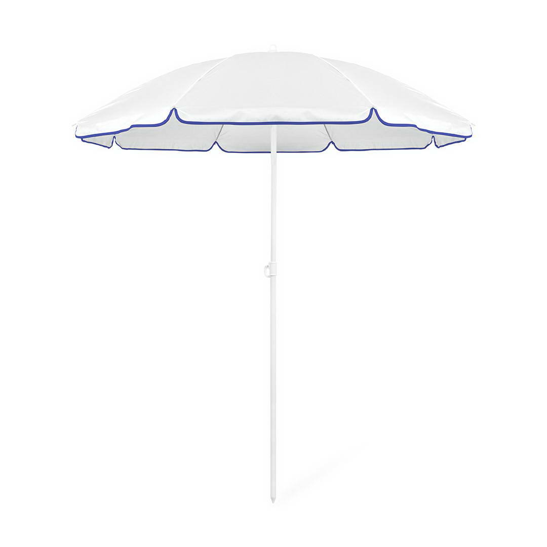 Ombrellone a 8 pannelli in resistente nylon in un'ampia gamma di colori vivaci. Da 150 cm di diametro, con bordi laterali, tubi metallici bianchi e altezza regolabile. Presentato in una custodia in PVC con tracolla.