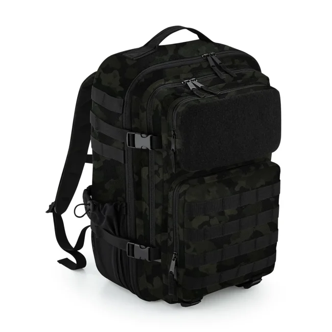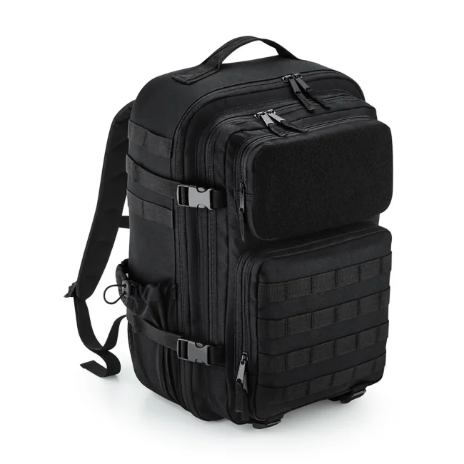 100% poliestere 600D. Zaino con dettaglio in fettuccia MOLLE. Scomparto imbottito per laptop 17". Fodera: Pol.210D. Tasca frontale Rip-Strip, tre grandi tasche anteriori con cerniera, doppie tasche a rete, tasche interne a rete. Pannello posteriore imbottito. Cinturino pettorale regolabile. Etichetta TearAway. Compatibile con patch Rip-Strip BG840 e BG841 e con BG241 e BG242 Modulr Multipocket.