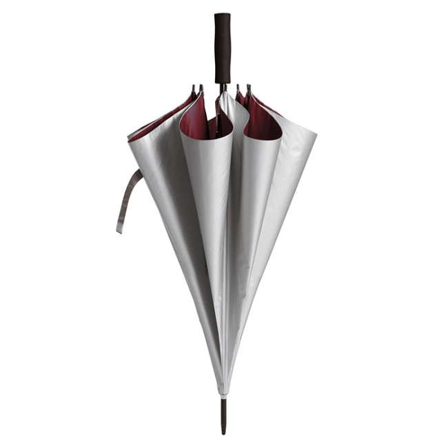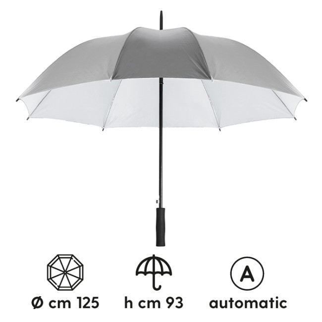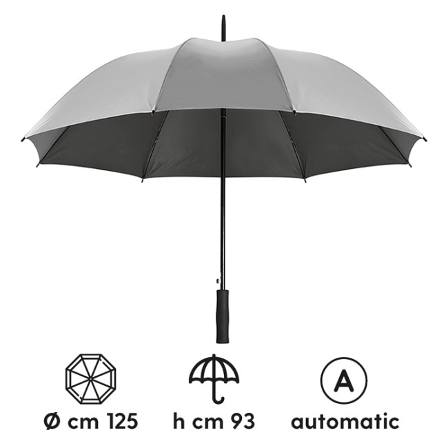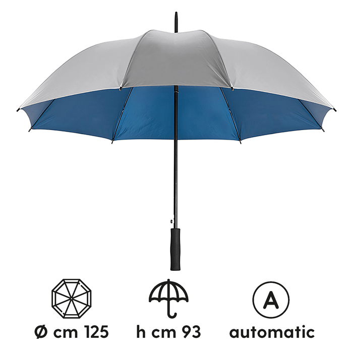 maxi ombrello automatico sistema di apertura con meccanica di alta qualità struttura in fibra di vetro fusto e puntale in metallo nero manico in eva colore interno a contrasto chiusura con velcro tecnica di stampa consigliata: serigrafica - transfer