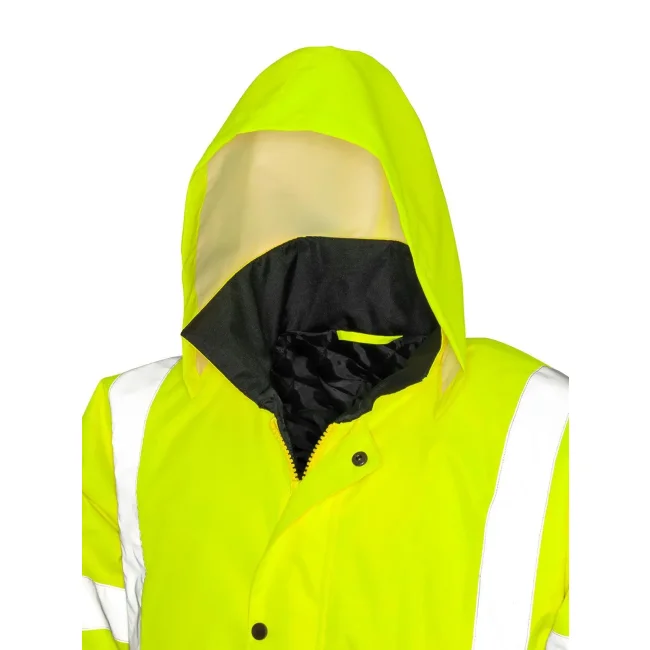 100% poliestere. Giacca da lavoro impermeabile 1000 mm, antivento, EN ISO 20471: 2013 + A1-2016 - Classe 3 (sia giallo che arancione), RIS-3279-TOM - Classe 3 (solo arancione), spalla riflettente 50 mm, fasce catarifrangenti su corpo e maniche, ampie tasche coperte da patta antivento, cappuccio a scomparsa con cordino regolabile, patta antivento con chiusura a bottone automatico, fodera trapuntata a rombi, cerniera robusta a doppio cursore, cuciture completamente nastrate, colletto rialzato, tasca interna, parte inferiore scura per mascherare lo sporco, adatta alla personalizzazione, senza etichetta.