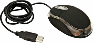 Mouse ottico "Tronic" con filo, in gommato nero e plastica trasparente, dalla quale si intravede una luce led, che cambia colorazione (i 7 colori arcobaleno).Confezione in scatola.