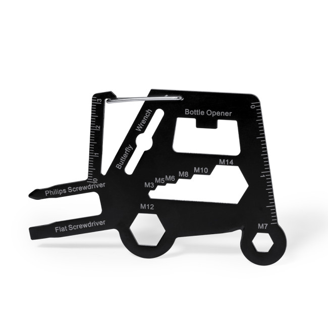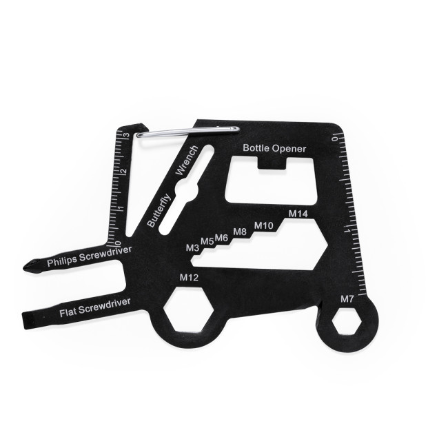 Multiutensile pratico in acciaio inox a forma di toro meccanico, offre 16 funzioni tra cui cacciavite piatto e a croce, chiave esagonale e apribottiglie. Include una clip a moschettone per un facile trasporto e presentato in un sacchetto di carta riciclata.