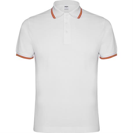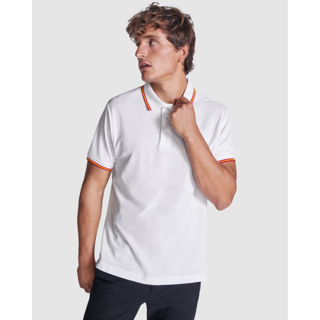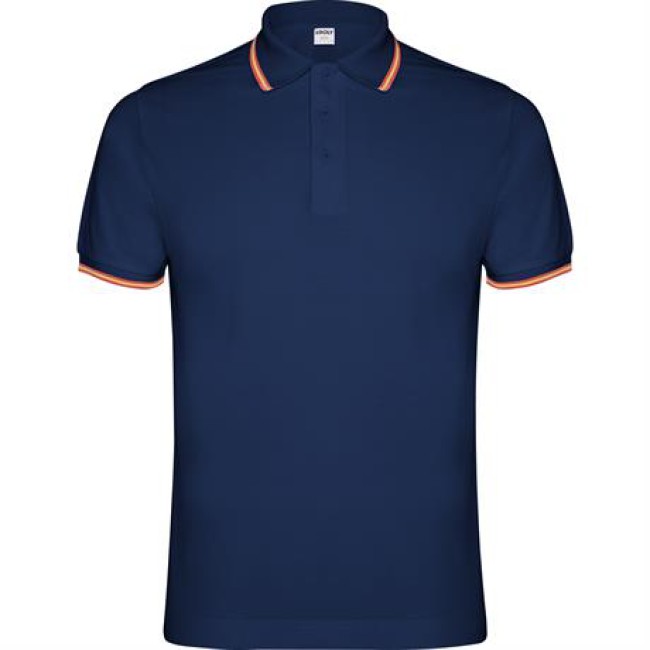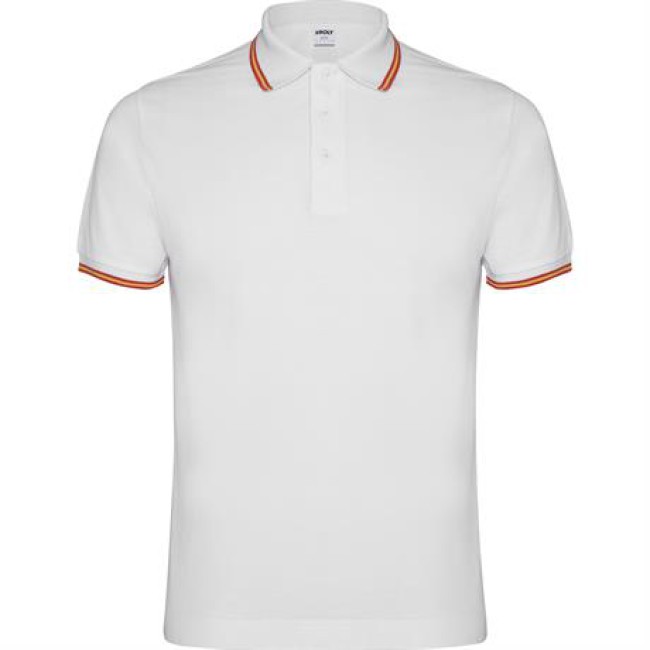 Polo manica corta 3 bottoni, colletto e polsini in jaquard. Copri cuciture di rinforzo nel colletto. Bandiera ricamata sul retro.