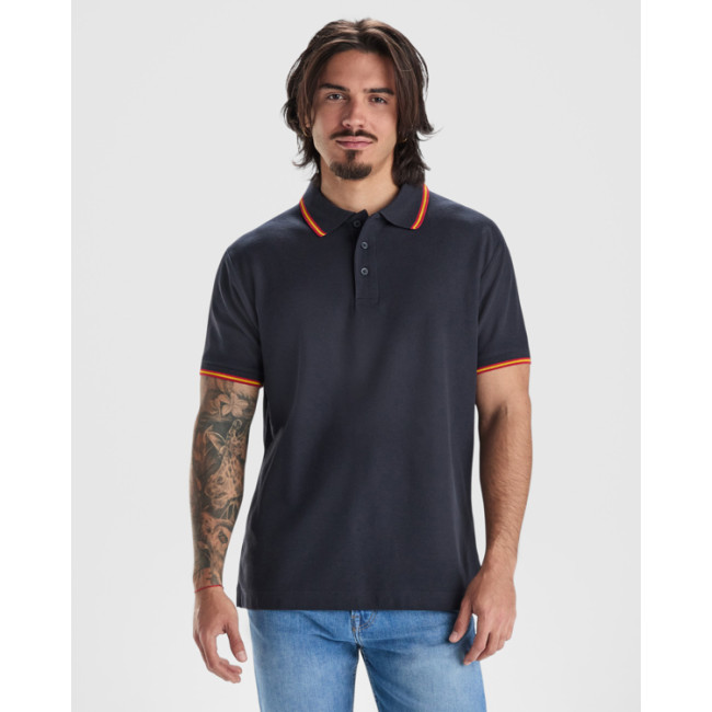 Polo a maniche corte con trattamento anti-pilling. Punto piqué. Colletto e maniche intrecciati a contrasto di colore 1x1. Chiusura a 3 bottoni. Scollo nastrato in tessuto coordinato e carré interno posteriore. Dettaglio bandiera ricamata sul retro. Tasca, opzionale. Lavabile a 60°C.