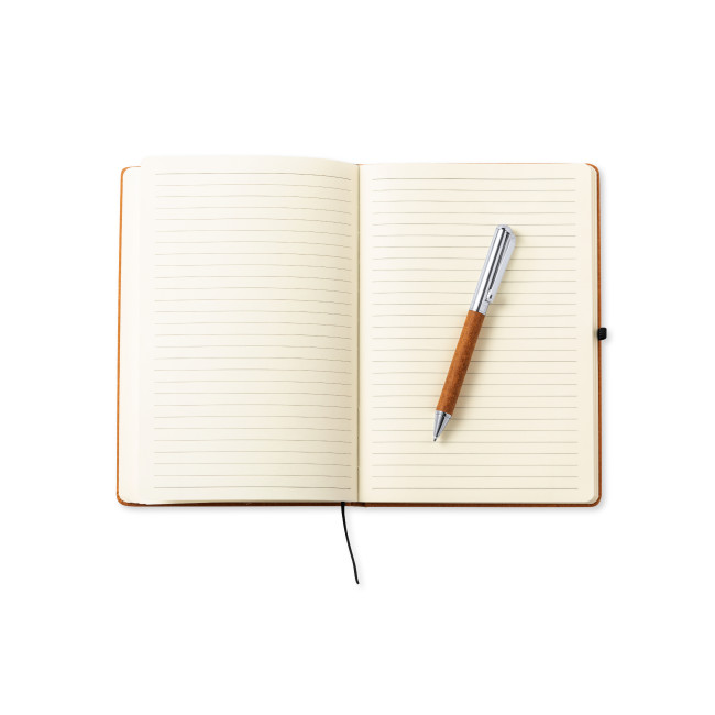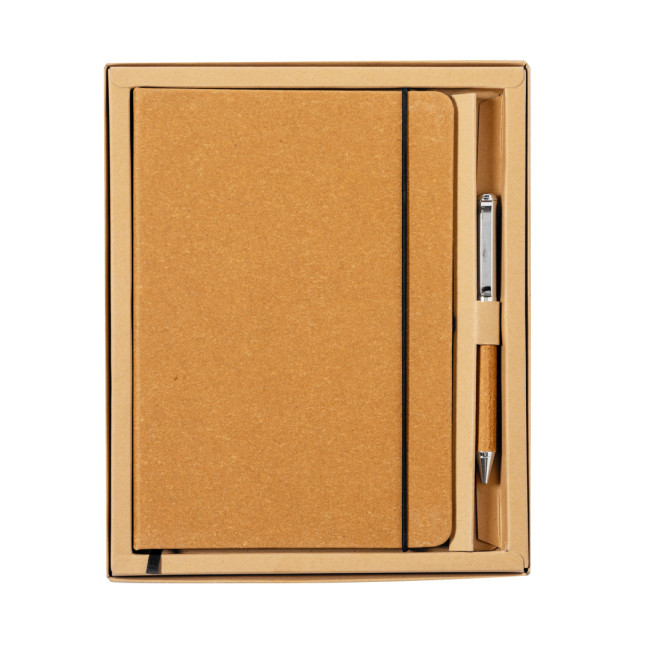 Set di block notes e penna in pelle riciclata. Include: Block notes con copertina rigida in pelle riciclata. All'interno 100 fogli a righe singole. Include un segnalibro, una chiusura elastica e un portapenne coordinato. Con etichetta pelle riciclata sulla quarta di copertina.Penna in metallo cromato con fusto rivestito in pelle riciclata. Elegante clip in metallo e accessori coordinati. Meccanismo a rotazione e inchiostro blu, con etichetta pelle riciclata sul fusto.Set presentato in un astuccio individuale dal design kraft, con scomparto separato per blocco note e penna.La pelle riciclata recupera le fibre scartate nel processo di produzione della pelle, riducendo al minimo i rifiuti di materiale e contribuendo a ridurre l'impatto ambientale, pur mantenendo le proprietà originali.