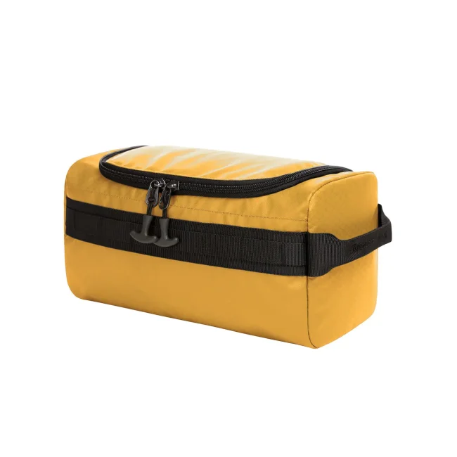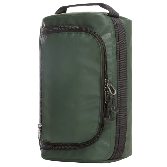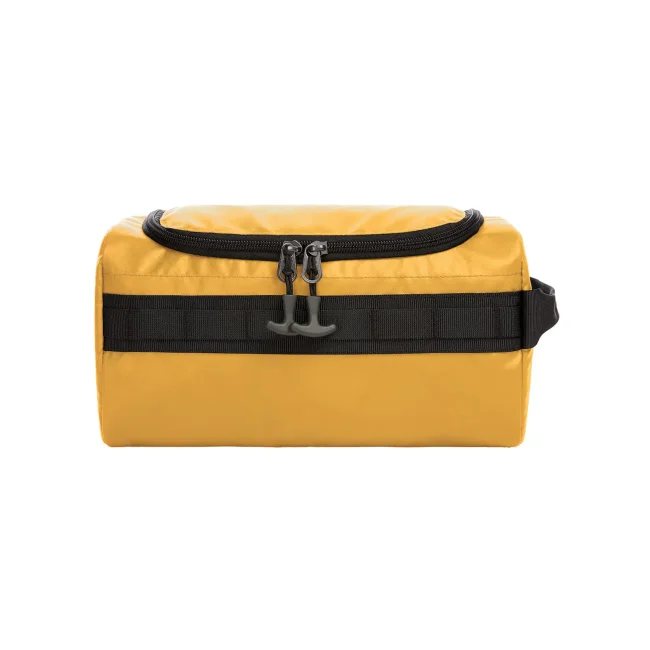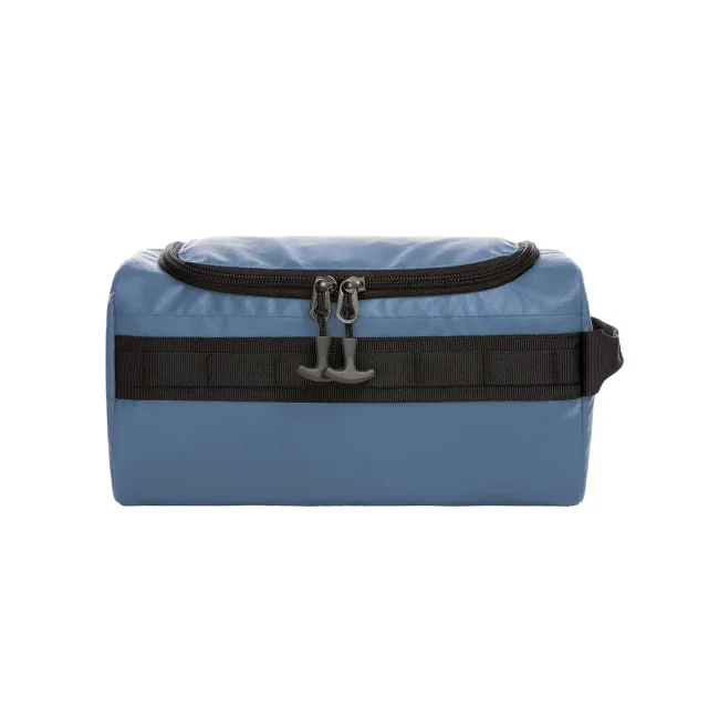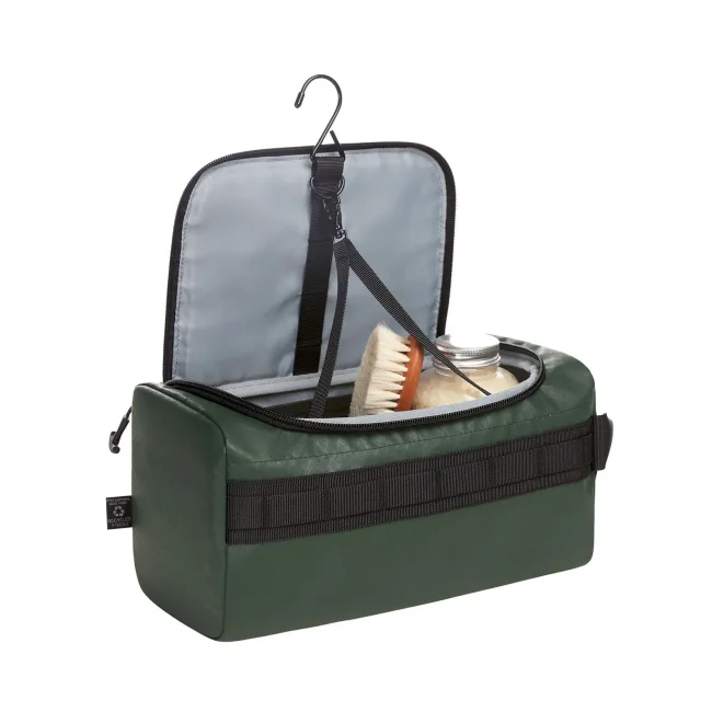 RPET 600d. Elaborata lavorazione e imbottitura, da installare o appendere, scomparto con chiusura lampo con coperchio, funzionale nastro ad anello interno ed esterno, due scomparti a inserto con rete e una tasca piatta con lampo interna, manico