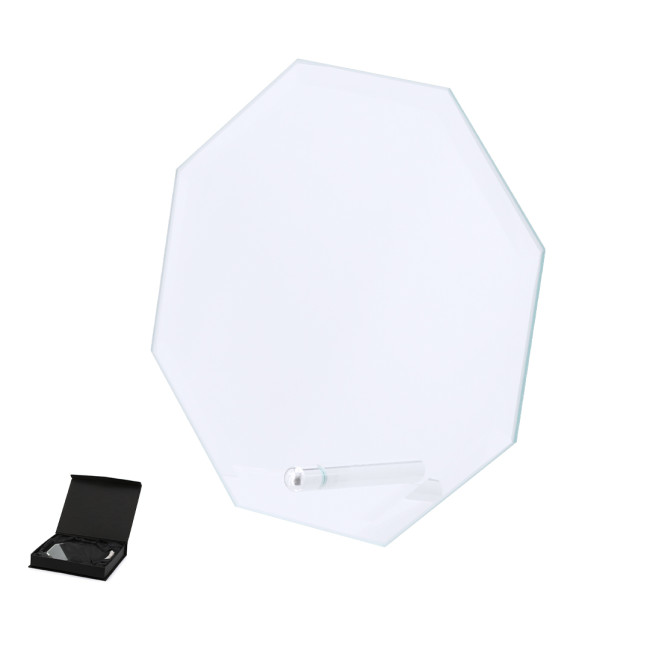 Targa per trofei in vetro spesso con un elegante design ottagonale. Appositamente progettata per la stampa laser e presentata in una custodia protettiva individuale.