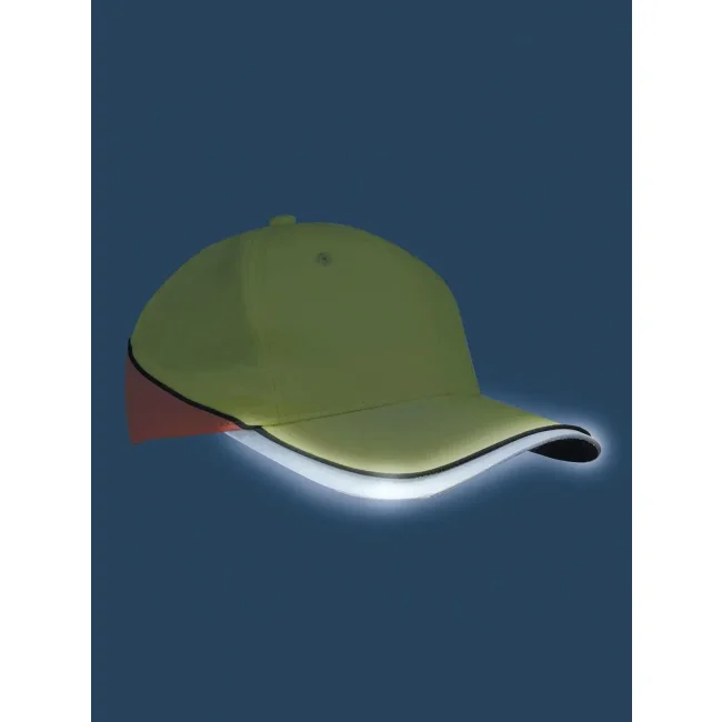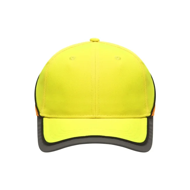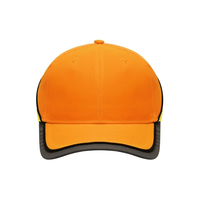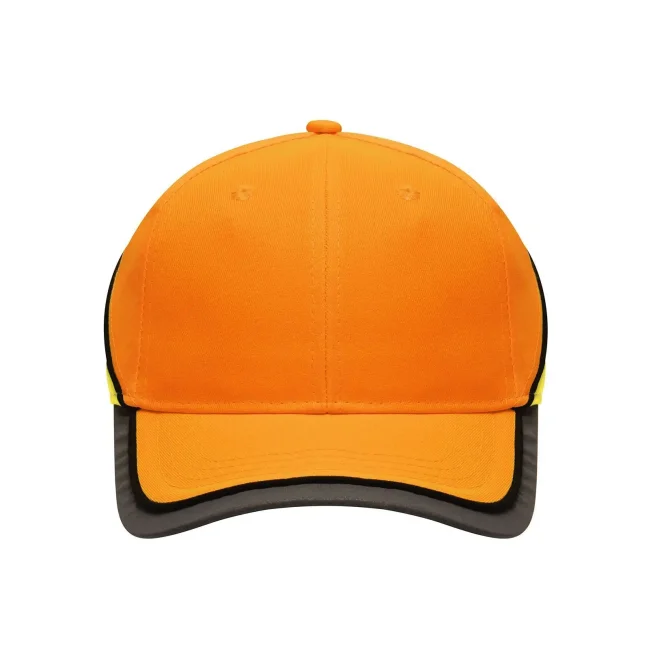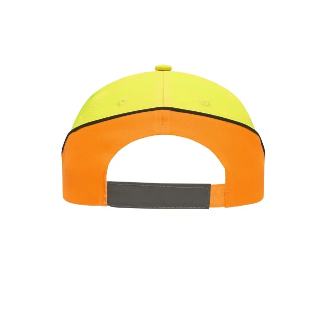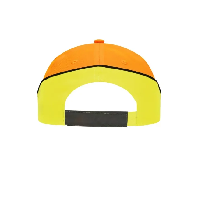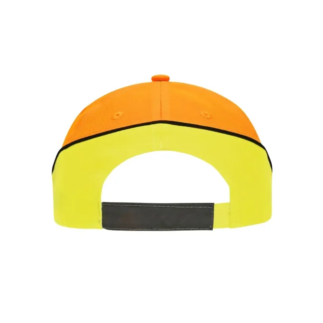 100% poliammide. Cap funzionale a 6 pannelli in colori accesi catarifrangente 2 fori traspiranti imbastiti , 4 cuciture sulla visiera, Cucitura decorativa intorno al cap, Pannelli frontali laminati, Fascetta tergisudore imbottita in satin, Chiusura in velcro e bordino intorno alla visiera catarifrangente conforme. Velcro, policromo, Safety