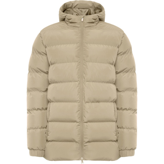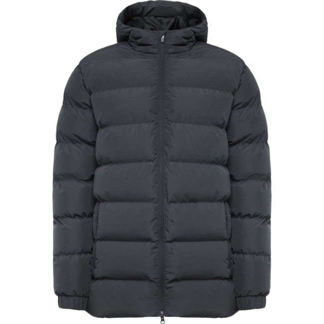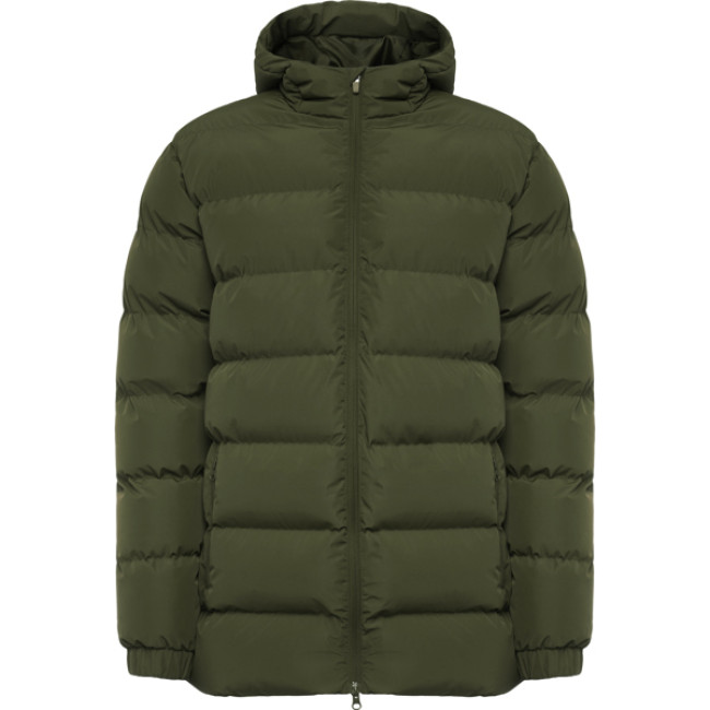 Parka sportivo imbottito:Cappuccio fisso con visiera.Zip frontale abbinata con doppio tiretto e protezione per il mentoPolsini elasticizzati.Due tasche esterne con cerniera.Accesso interno per la personalizzazione.