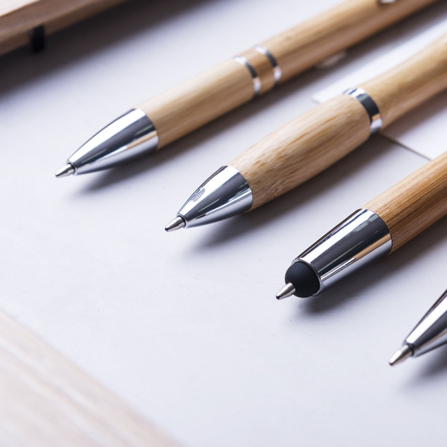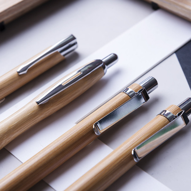 Penna della linea natura con fusto in legno di bambù. Meccanismo a pulsante, con clip fustellata e dettagli cromati. Con cartuccia jumbo e inchiostro nero.
