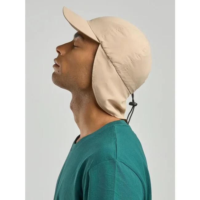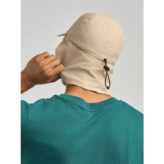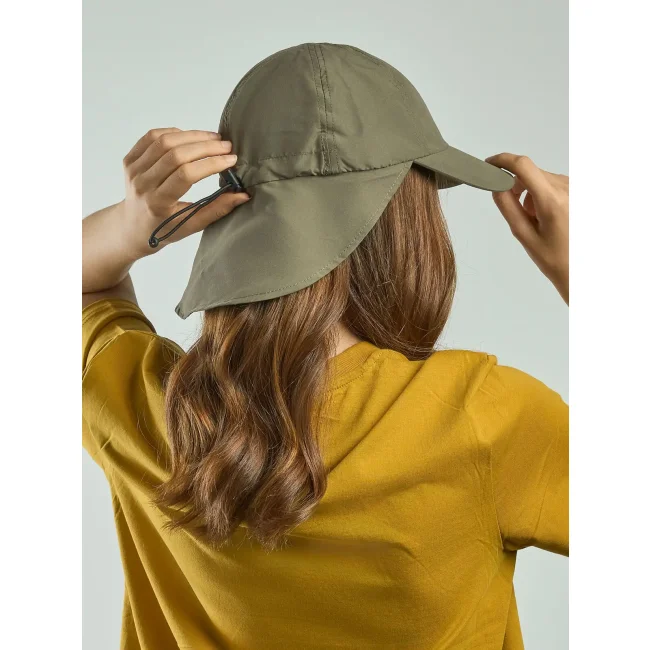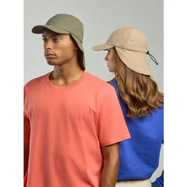 100% poliestere riciclato. Cappello da viaggio outdoor in poliestere riciclato con protezione UV, 6 pannelli frontali destrutturati e visiera curva. Parasole al collo sul retro con chiusura regolabile con coulisse elastiche, etichetta removibile. Vecchio codice: ATNOMA