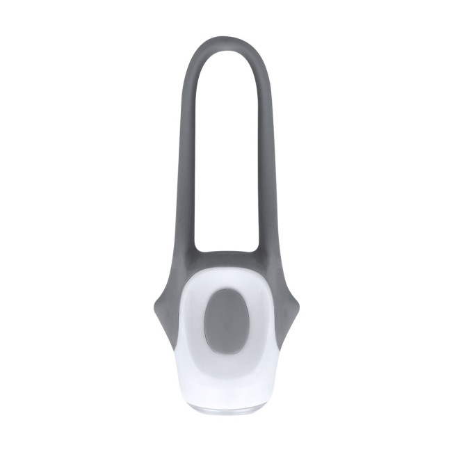 Luce di sicurezza per biciclette in ABS e silicone. Ha 2 luci LED, fisse e lampeggianti, con pulsante accensione e spegnimento. Include manico in silicone per un facile trasporto. Batteria a pulsante inclusa. Ideale per chi cerca sicurezza, praticità e design compatto.