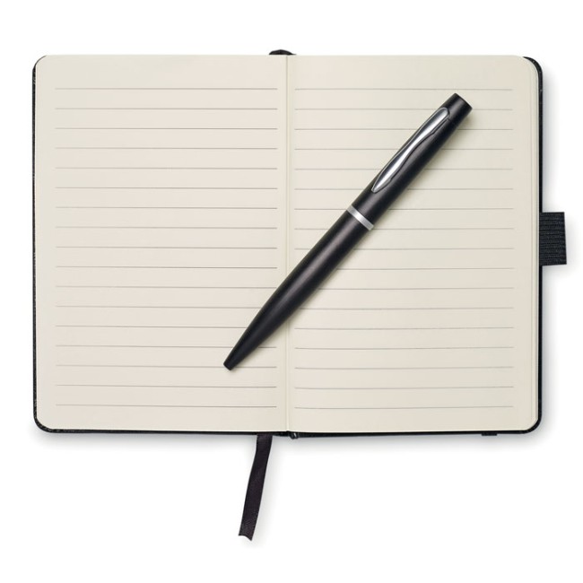 Notebook A6 con penna. Copertura rigida in PU. 144 pagine a righe (72 fogli). Cinturino di chiusura elastico e portapenne abbinati. Penna a sfera a bottone in metallo abbinata. Inchiostro blu. FSC MIX CREDIT | P7.1 | FSC-C213206