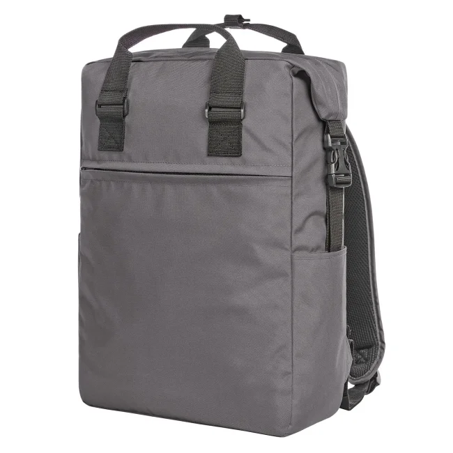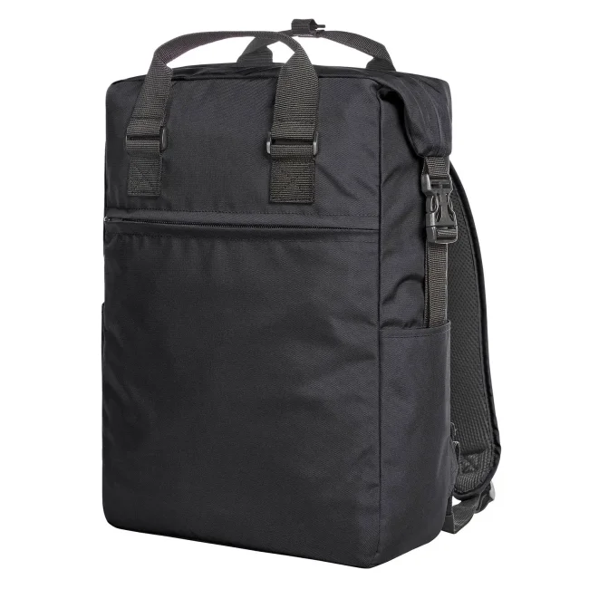 100% RPET. Zaino rettangolare, ampio scomparto principale con chiusura lampo bidirezionale, tasca per notebook imbottita, tasca a inserto piatta interna. Fibbie laterali collegabili per fungere da manico. Ampia tasca anteriore con chiusura lampo, due tasche a inserto laterali, spallacci imbottiti, manici con bottone.