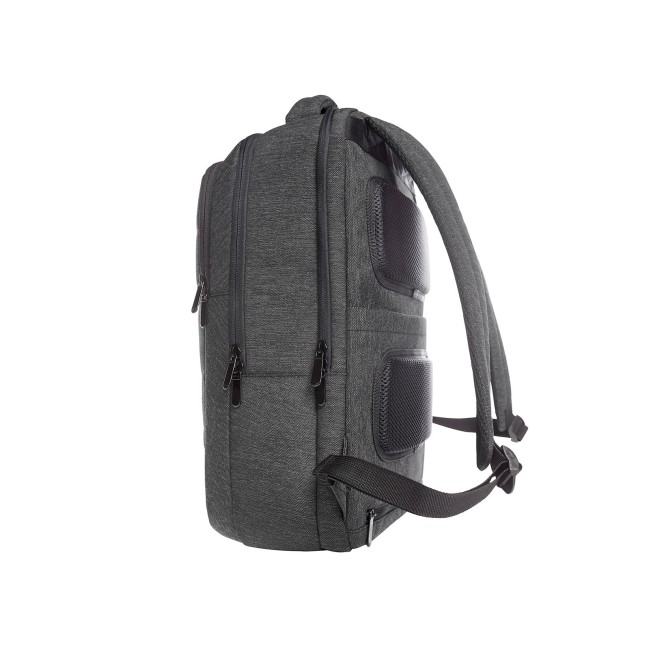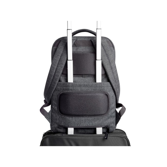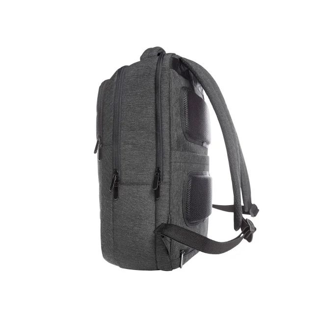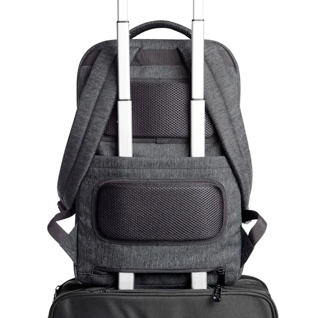 100% poliestere 900d. Zaino imbottito con lato anteriore in trapunta e supporto HFL®per un logo, tasca anteriore con chiusura lampo e due tasche a inserto piatte, scomparto per notebook con chiusura lampo imbottita, ideale per il fissaggio all'asta del trolley, spallacci imbottiti regolabili, manico imbottito. Area di stampa: W5,7 x H 2,3 cm. Dimensioni: 33x46x12 cm.