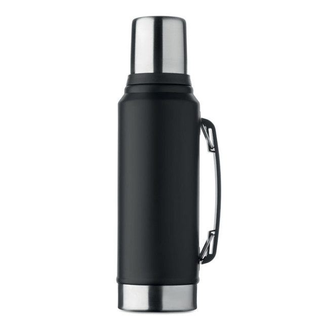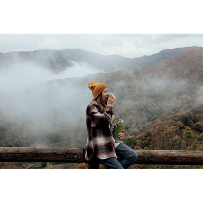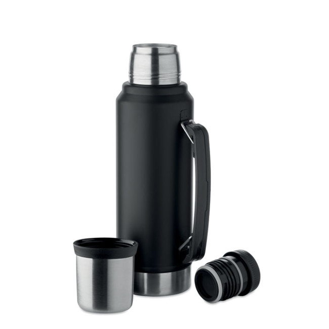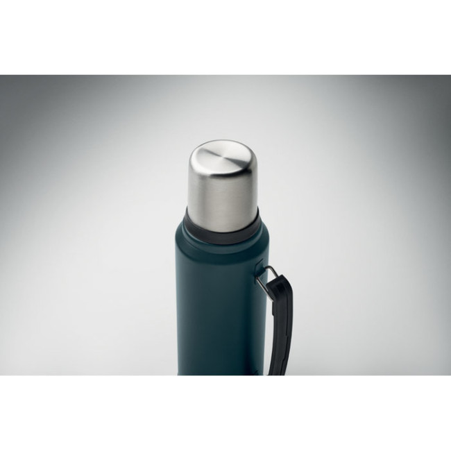 Bottiglia isolante a doppio strato in acciaio inox riciclato (90% acciaio inox riciclato e 10% acciaio inox) con manico laterale. Con coperchio in PP e tazza in acciaio inox riciclato. Senza perdite. Capacità: 1L.