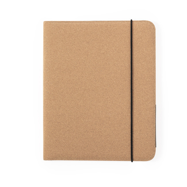 Elegante cartellina in sughero naturale. Con un'ampia tasca interna per i documenti, 4 portacarte, passante elastico per penna e blocco da 20 fogli con layout a righe singole. Si chiude con un elastico esterno. Confezionato singolarmente in un sacchetto riciclato. Realizzata con elementi di origine vegetale per promuovere l'uso di materie prime naturali e ridurre le emissioni inquinanti.