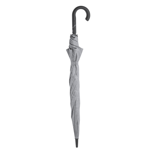 Ombrello Dewey di alta qualità con un diametro di 130 cm, realizzato in materiale poliestere 150D in elegante tonalità grigio erica. Dotato di apertura automatica, aste in fibra di vetro e sistema antivento, presenta un manico ergonomico in morbido ABS e viene fornito in una borsa riciclata.