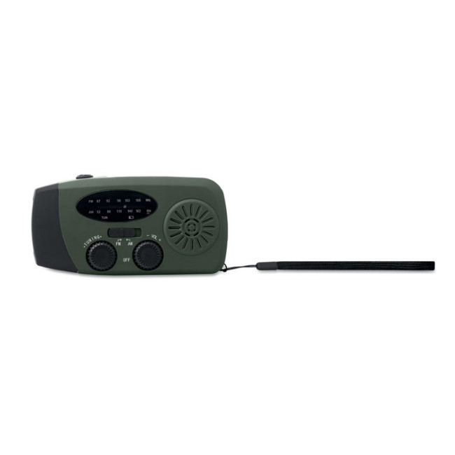 Radio portatile AM/FM in ABS con torcia a LED (2 impostazioni) e un powerbank da 1200 mAh per la ricarica di emergenza. Autoalimentata con energia solare e manovella.