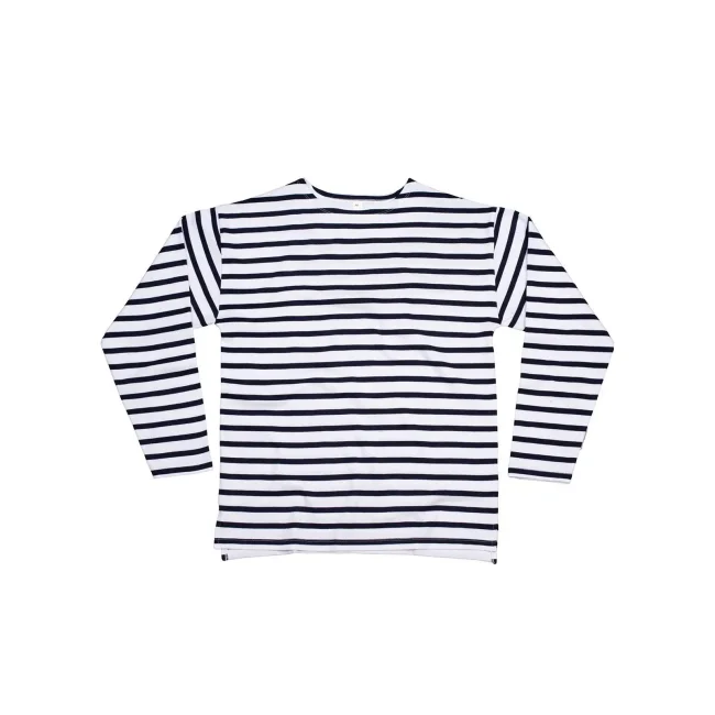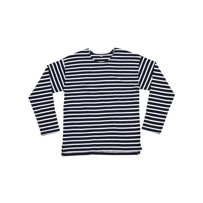 100% Cotone organico interlock. Maglia unisex maniche lunghe, con spacchi laterali, spalle scese, più lunga sul retro, a righe tinta in filo, etichetta strappabile.