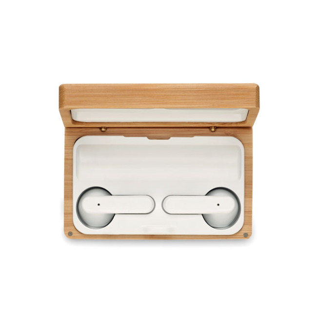 Auricolari TWS con microfono in una custodia di bamboo. Include un power bank da 1200 mAh con ingresso di tipo-C e uscita di tipo-A. Associazione automatica.