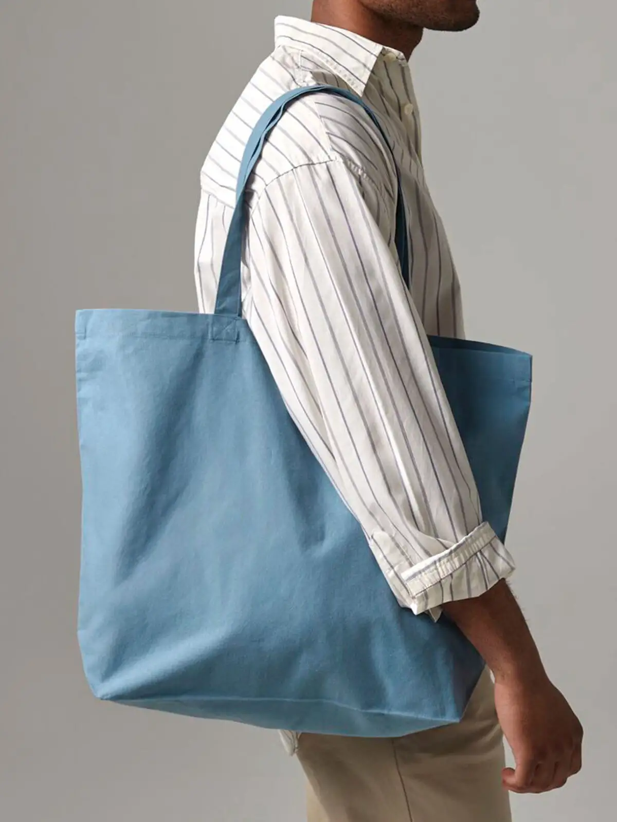 100% cotone organico. Maxi shopper tinta con coloranti naturali di derivazione sostenibile, che creano sottili variazioni di colore e sbaidiscono magnificamente nel tempo, portabile a mano o a tracolla, etichetta rimovibile. Lunghezza manici 58cm, dimensioni 34x39x13,5 capacità 18 lt.