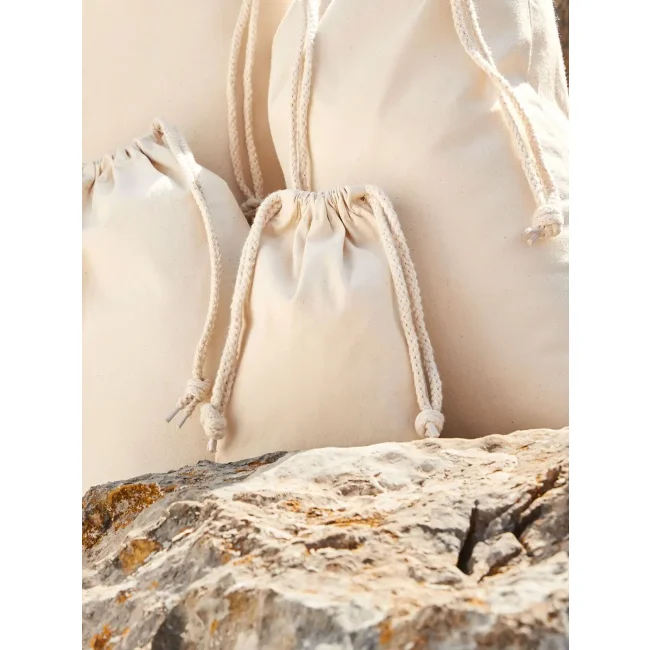100% cotone organico. Sacchetto in cotone organico certificato, ampia superficie di stampa, chiusura con cordoncino. Etichetta removibile. Dimensioni: XS: 14x20.5 cm, cap. 1 lt. - S: 23x34 cm, cap. 3 lt. - M: 31x48 cm, cap. 8 lt. - L: 40x61.5 cm, cap. 15 lt.