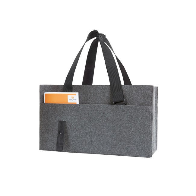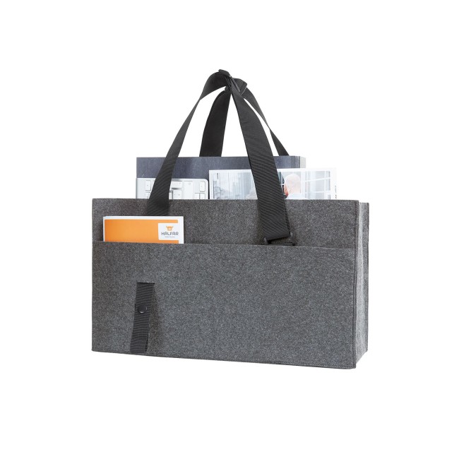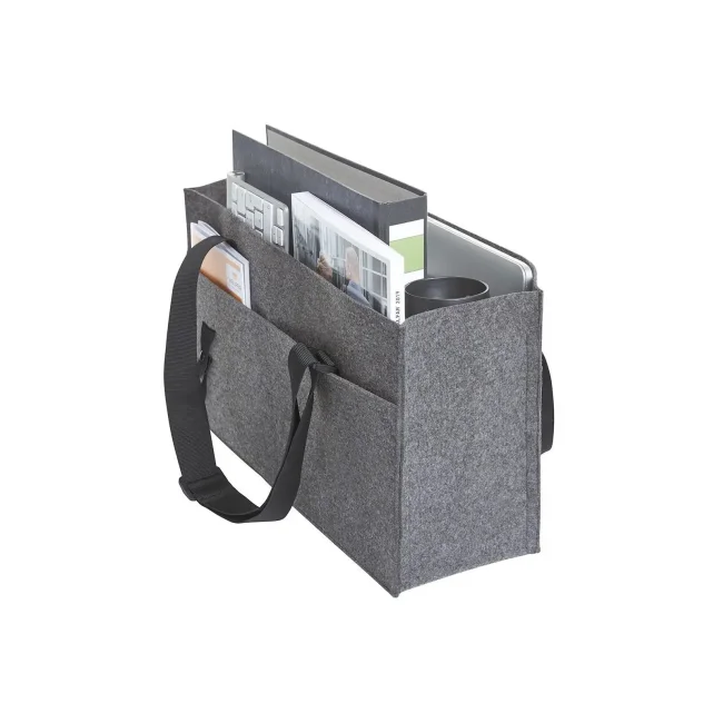 100% feltro. Organizer con ampio scomparto principale, tasca a inserto piatta, tasca a inserto con chiusura lampo, due passanti di fissaggio, ad es. per bottiglie, tasca per bigliettini da visita, tre tasche a inserto interne, tre tasche a inserto esterne, cinturini di lunghezza regolabile, linguetta di fissaggio, ad es. per la cintura dell'auto. Dimensioni: 45x25x15 cm. Area personalizzabile: sulla tasca frontale 9x8 cm.