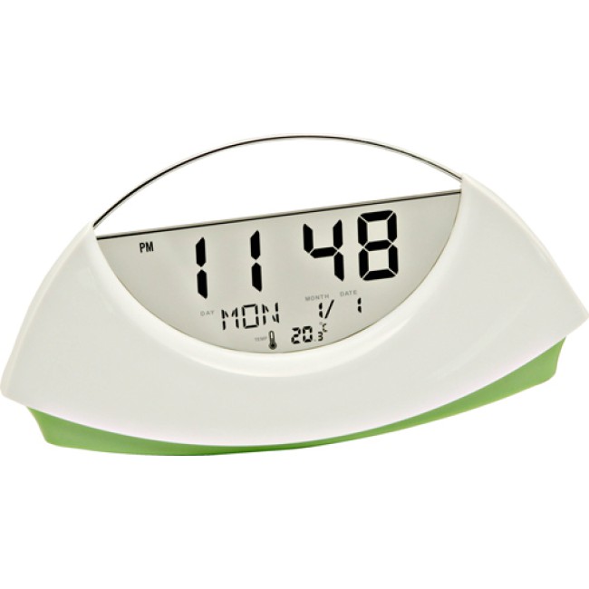 Orologio da tavolo bianco con profili verdi, con termometro,datario e sveglia. La linea ed il peso lo rendono adatto anche da fermacarte. Astuccio scatola di cartoncino.