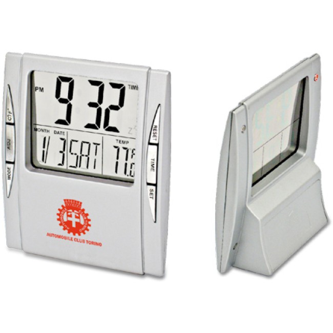 Orologio sveglia da scrivania elettronico, indica l'ora, la data, il mese, il giorno, la temperatura in C? e in F?. Funzionamento a batterie (non incluse). Confezione in polybag.
