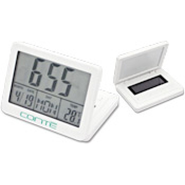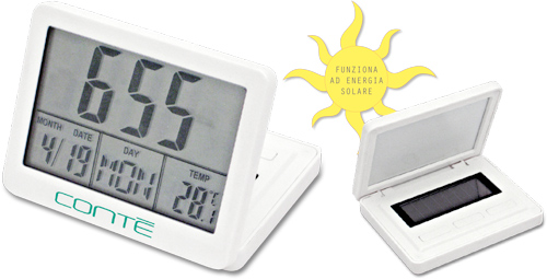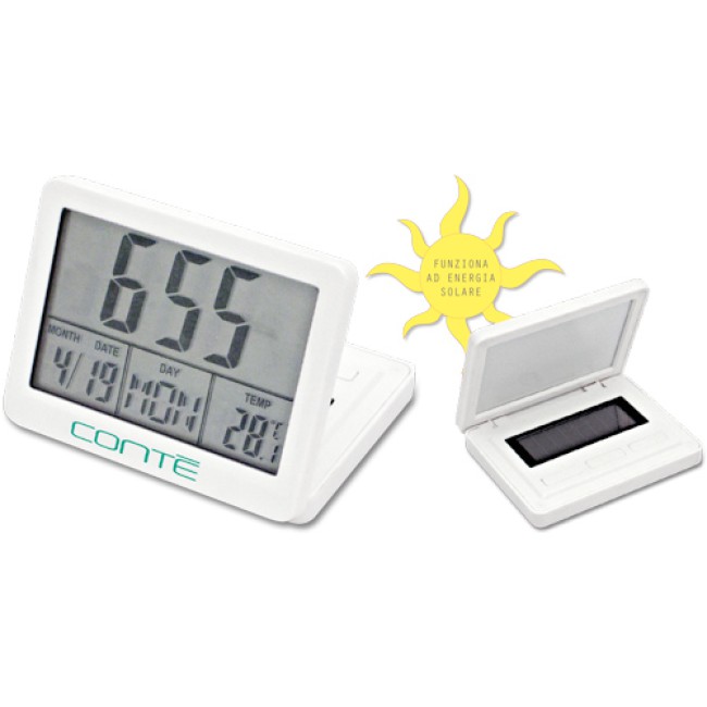 Orologio da tavolo richiudibile, funzioni: ora,data,giorno,temperatura.Batterie non incluse. Confezione in cartoncino bianco.