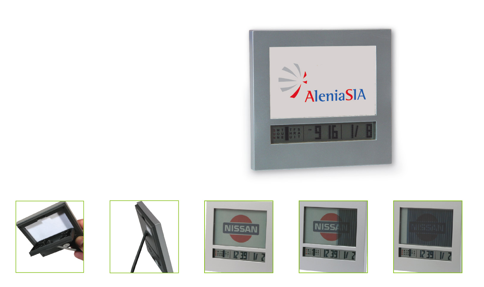 Orologio multifunzionale LCD in silver, dotato di un display intercambiabile che può essere personalizzato con logo o foto. Include batterie e viene fornito in una confezione elegante, ideale per un regalo o un uso personale.