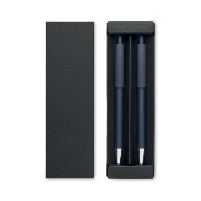 Set di penne in alluminio riciclato con 1 penna a sfera e 1 penna a inchiostro di grafite. Inchiostro blu. Presentato in una scatola di carta riciclata.