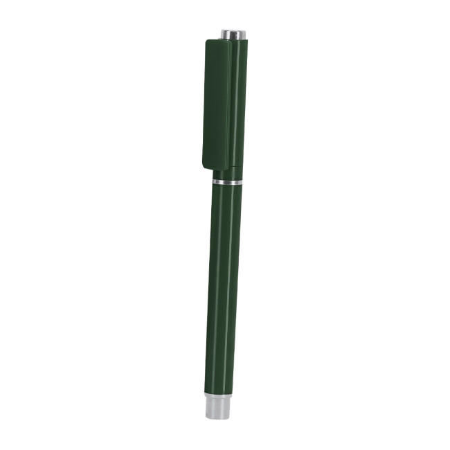 Elegante rullo in ABS riciclato. Dettagli con finitura argento, corpo con finitura massicia. Con cartuccia jumbo, inchiostro blu e chiusura del cappuccio. Include il distintivo RAFS.