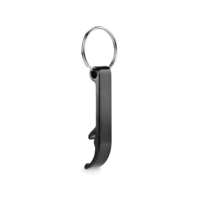Apribottiglie in alluminio riciclato con finitura lucida e anello portachiavi.