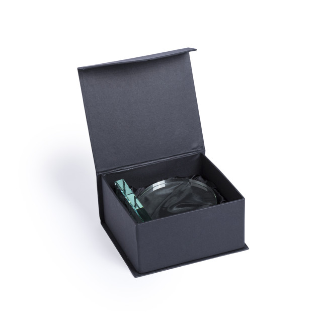 Targa per trofei in vetro spesso con elegante design circolare e base quadrata. Appositamente progettata per la stampa laser e presentata in una custodia protettiva individuale.